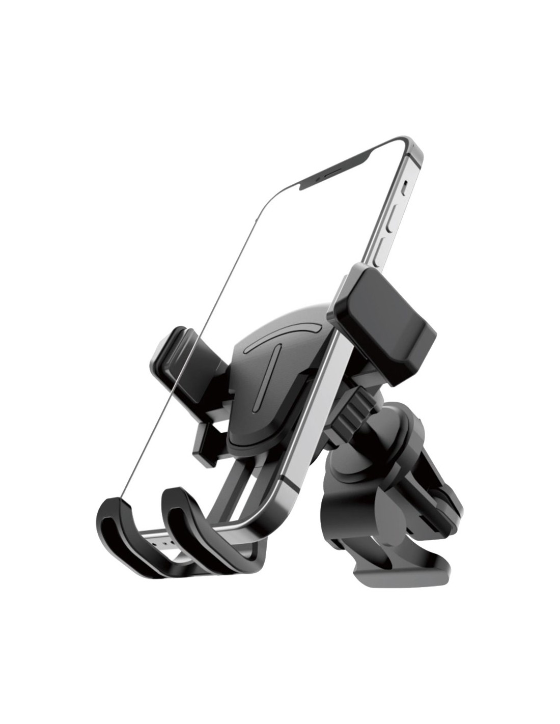 Universelle Autohalterung mit verstellbaren Armen, die mit einem praktischen Clip an der Lüftungsöffnung des Fahrgastraums befestigt wird.