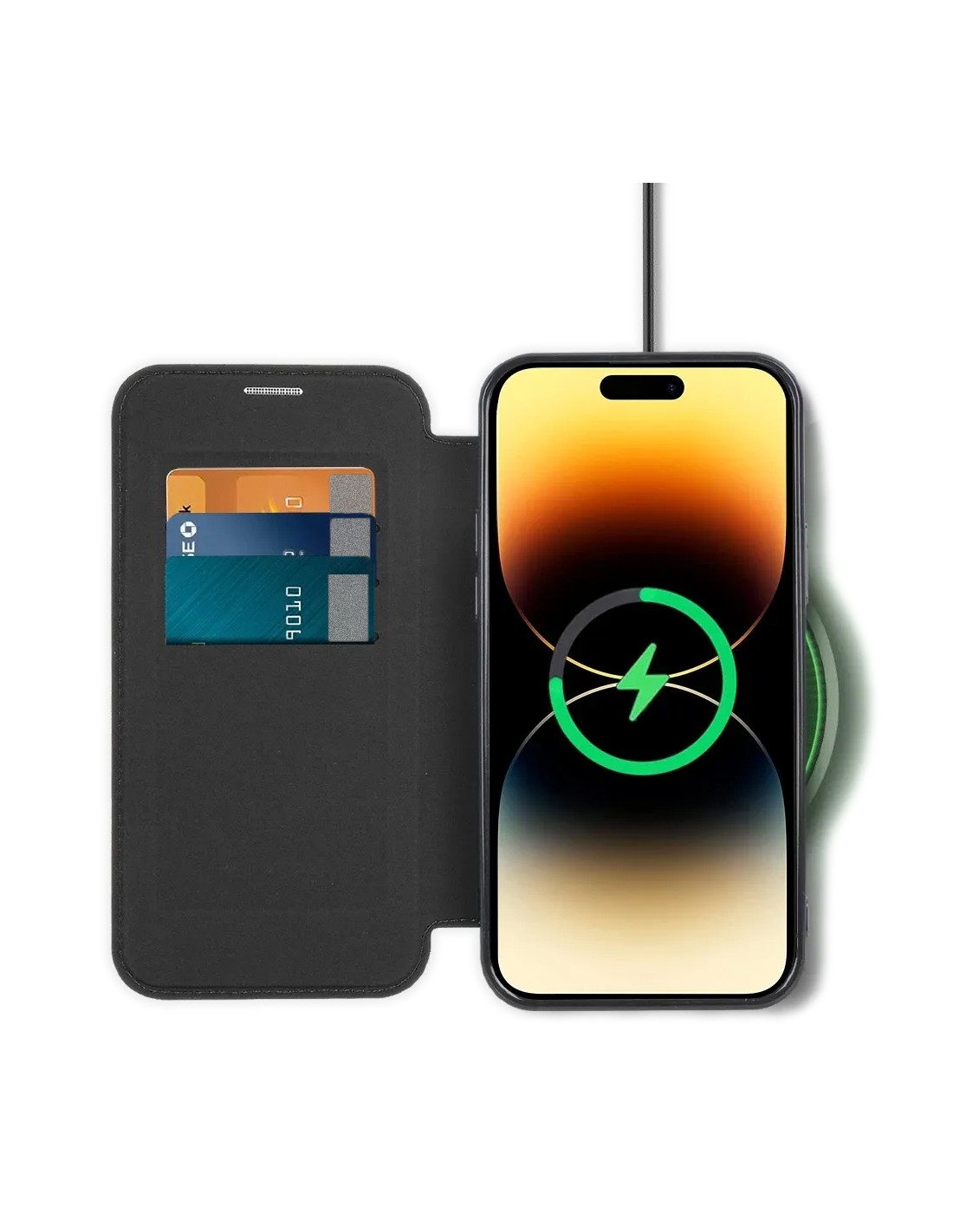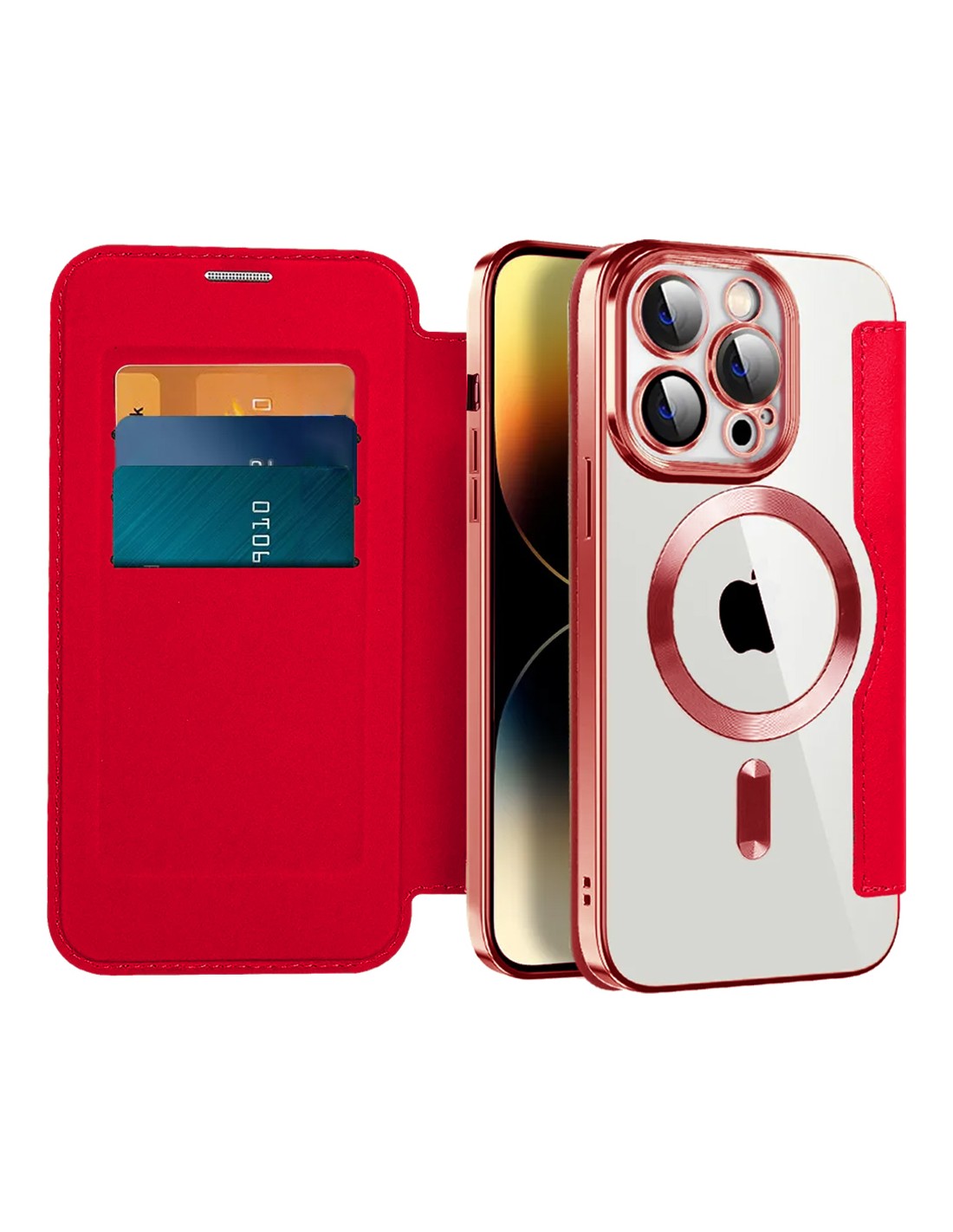 Magnetische Buchtasche aus faltbarem Kunstleder, transparent auf der Rückseite und mit Chrom-Effekt an den Rändern, kompatibel mit Qi-Aufladung.