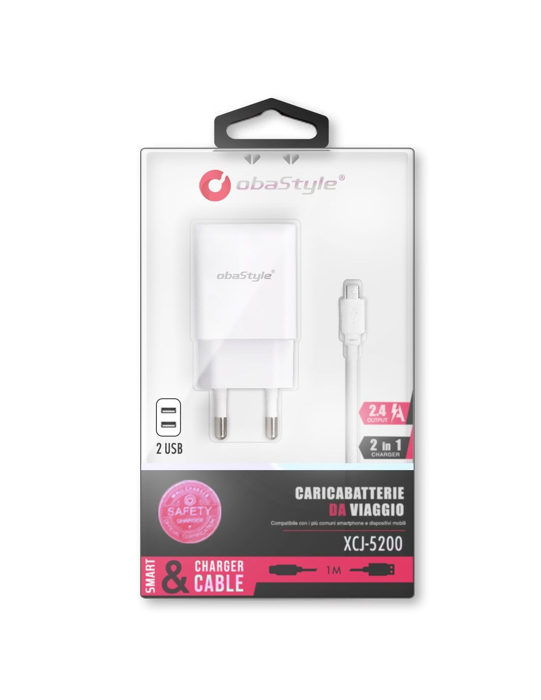 Universelles Netzladegerät mit zwei USB 2,4A-Anschlüssen, das für die Stromversorgung aller USB-kompatiblen Geräte geeignet ist. Das mitgelieferte V8-Anschlusskabel - 100 cm lang - ermöglicht die Stromversorgung aller kompatiblen Geräte