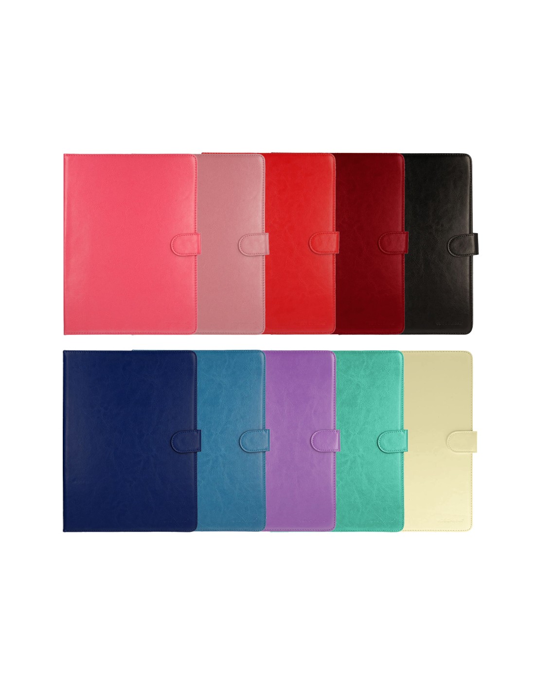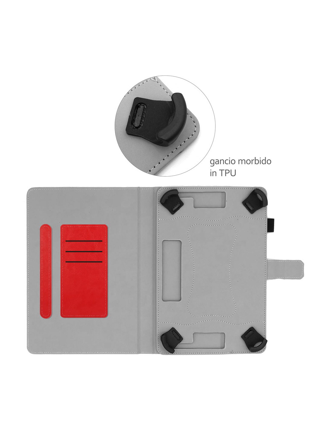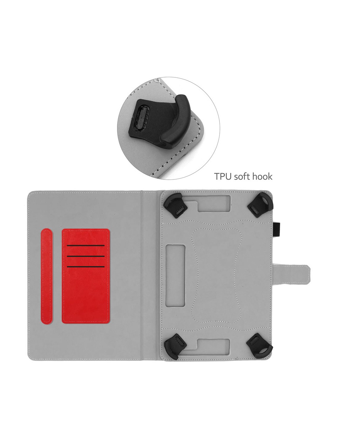 Universelle, faltbare Buchtasche mit modernem Design, bei der das Tablet in einen weichen, flexiblen Innenrahmen mit einem Kartenfach passt. Rück- und Fronttasche in einem, um Ihrem Gerät zusätzliche Sicherheit zu bieten.