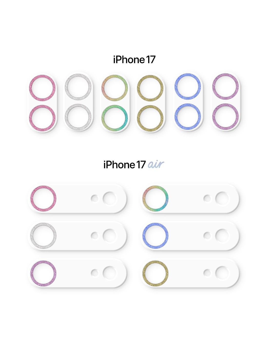 Full protection for iPhone camera lenses made of high-strength tempered glass with decorative glitter effect.