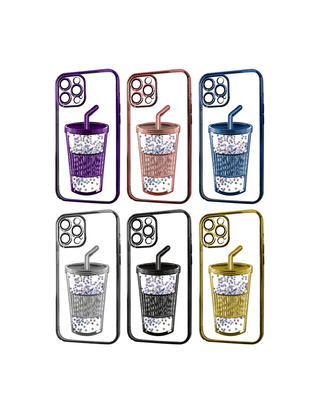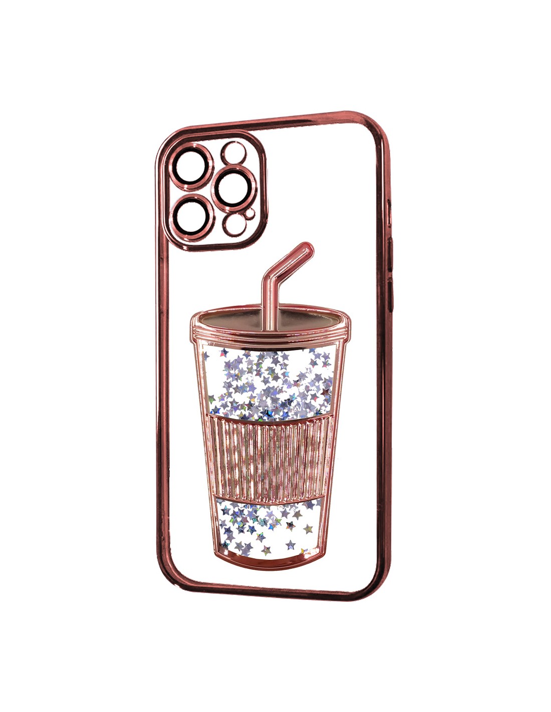 Semihard clear cover case with a sparkling 3D milkshake featuring liquid glitter and chrome-plated edges.