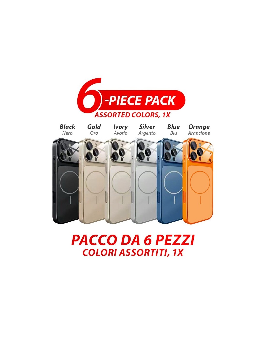Magnetic hard cover case in satin-finish glass with a camera protector made of tempered glass. 6-PIECE PACK – ASSORTED COLORS (1X)