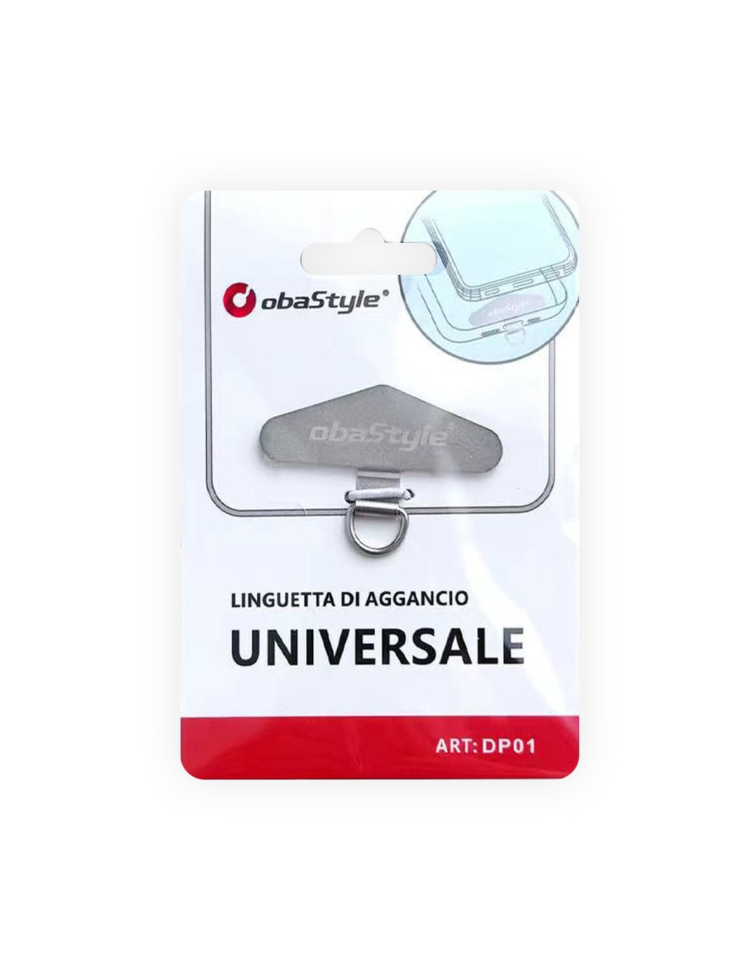 Universal phone patch made of metal for lanyards and straps, to be inserted into smartphone's charging hole.