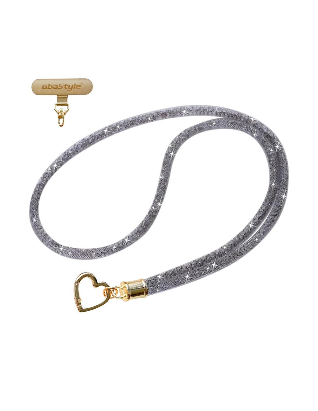 Neck strap equipped with a rhinestones, an heart hook and metal patch for smartphone case, available in assorted colours
