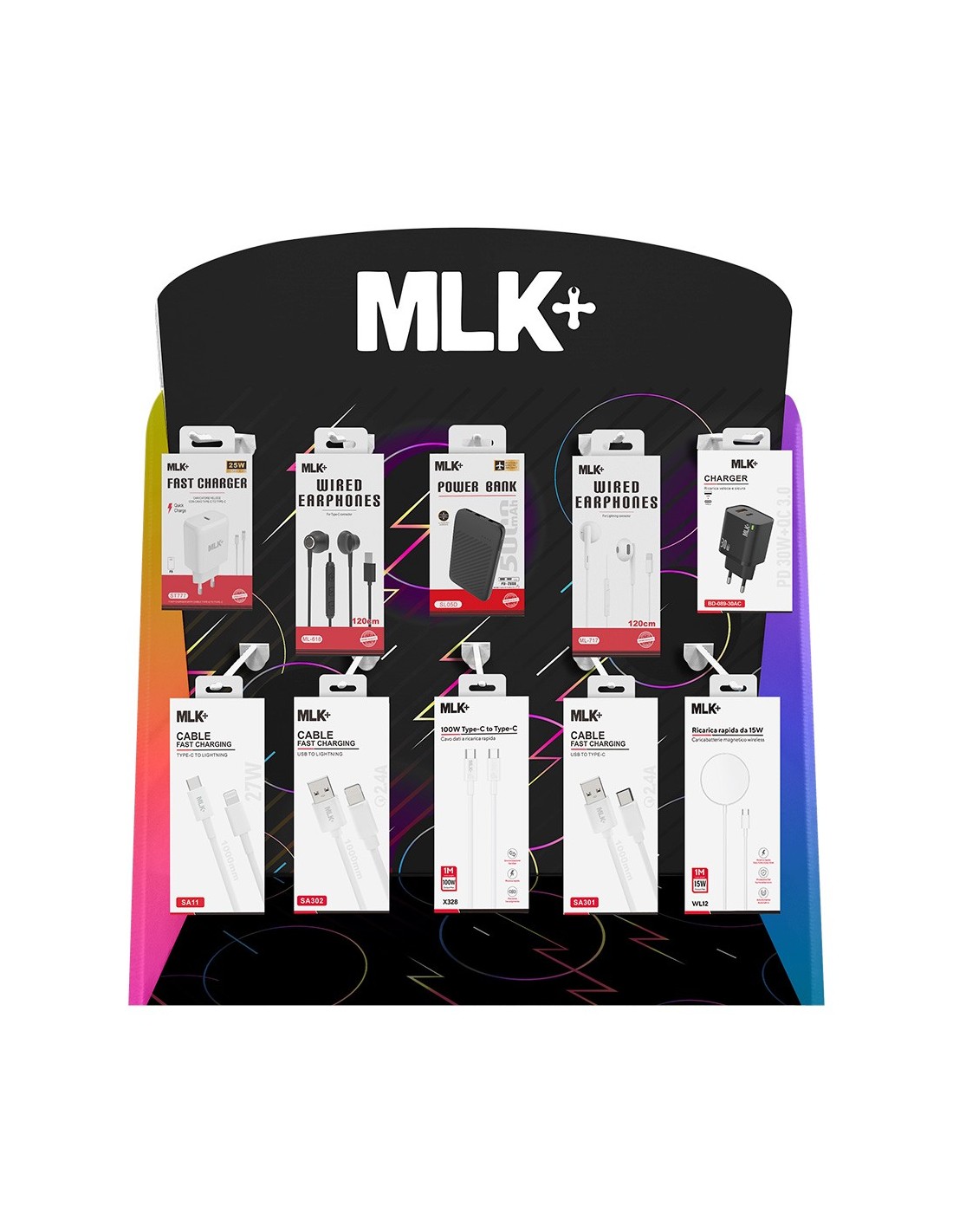 Présentoir de sol MLK+ en carton ondulé de 4,5 mm, dimensions 47x45x171cm.