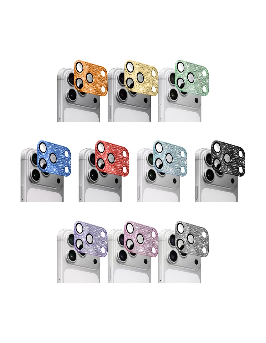 Protection complète des objectifs de l'appareil photo de l'iPhone enverre trempé haute résistance avec des strass décoratifs solidement fixés pour un effet scintillant.
