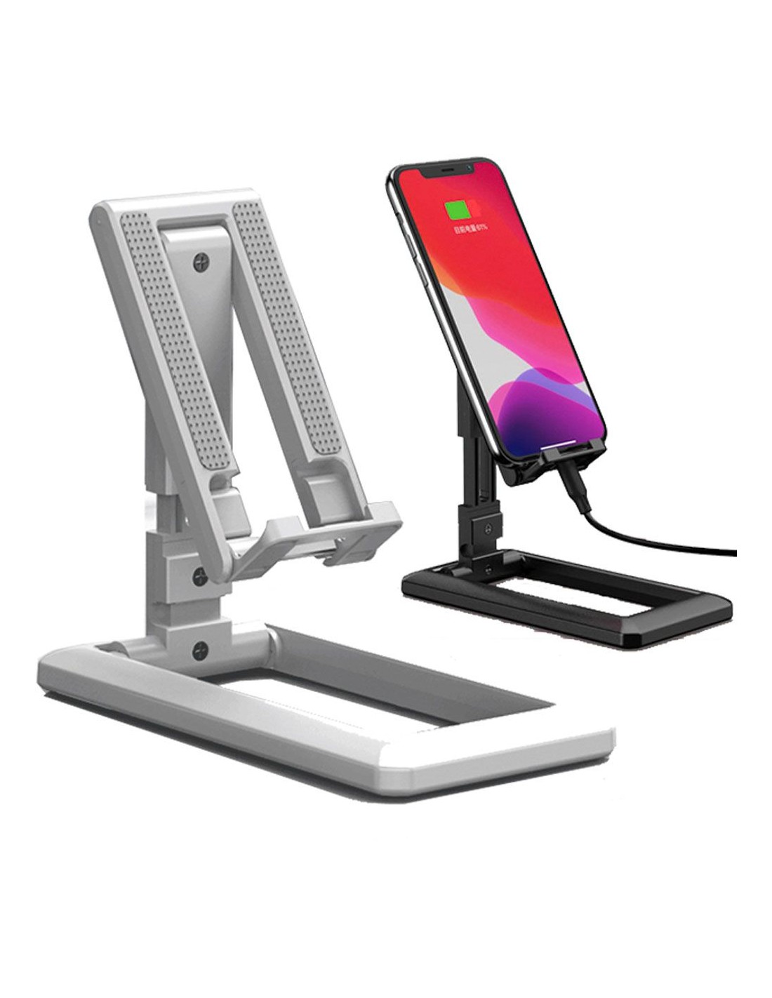Support de bureau universel pour smartphones en plastique robuste. Les bras sécurisent le smartphone et l'empêchent de tomber.
