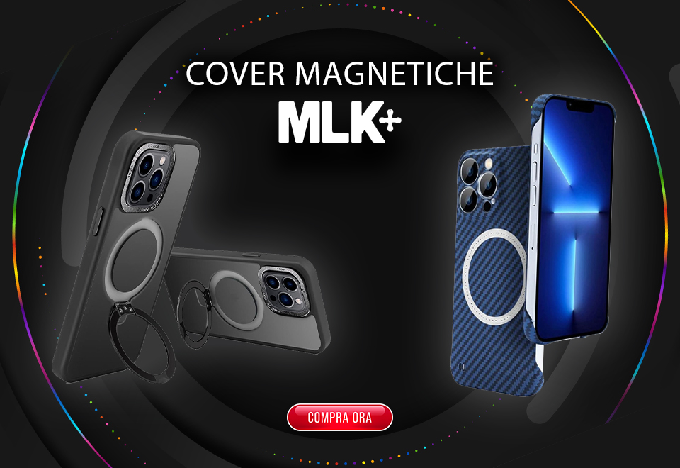 Cover rigida magnetica con finitura lucida compatibile con la ricarica Qi.