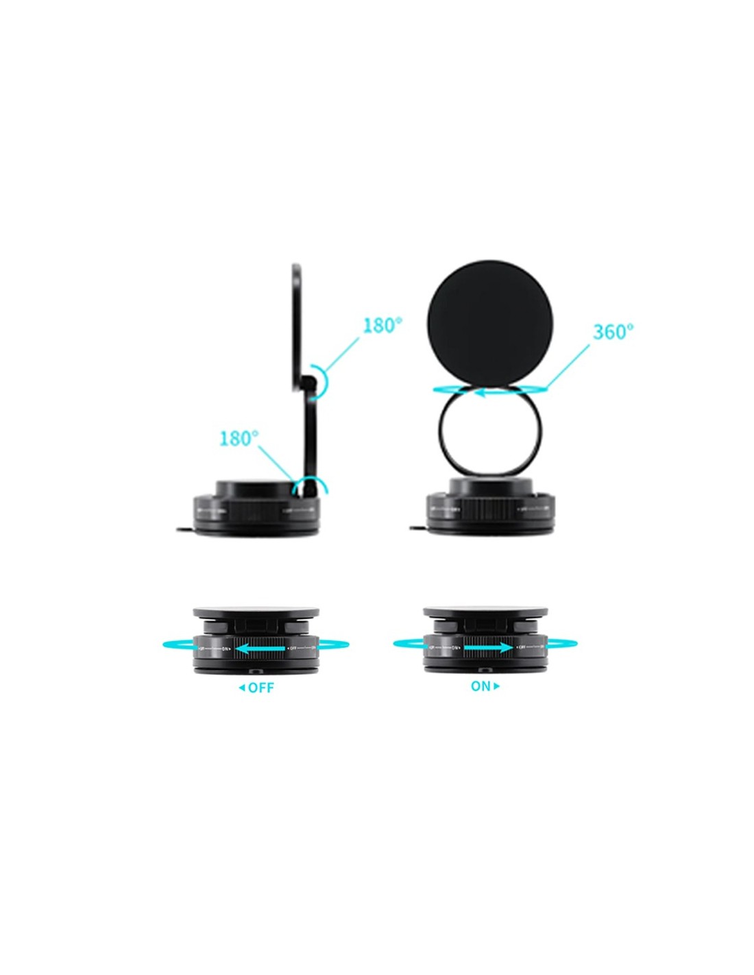Il suo design intelligente permette una rotazione a 360° e un’inclinazione fluida. Il sistema ON/OFF della ventosa garantisce un aggancio rapido e una rimozione semplice senza lasciare residui.