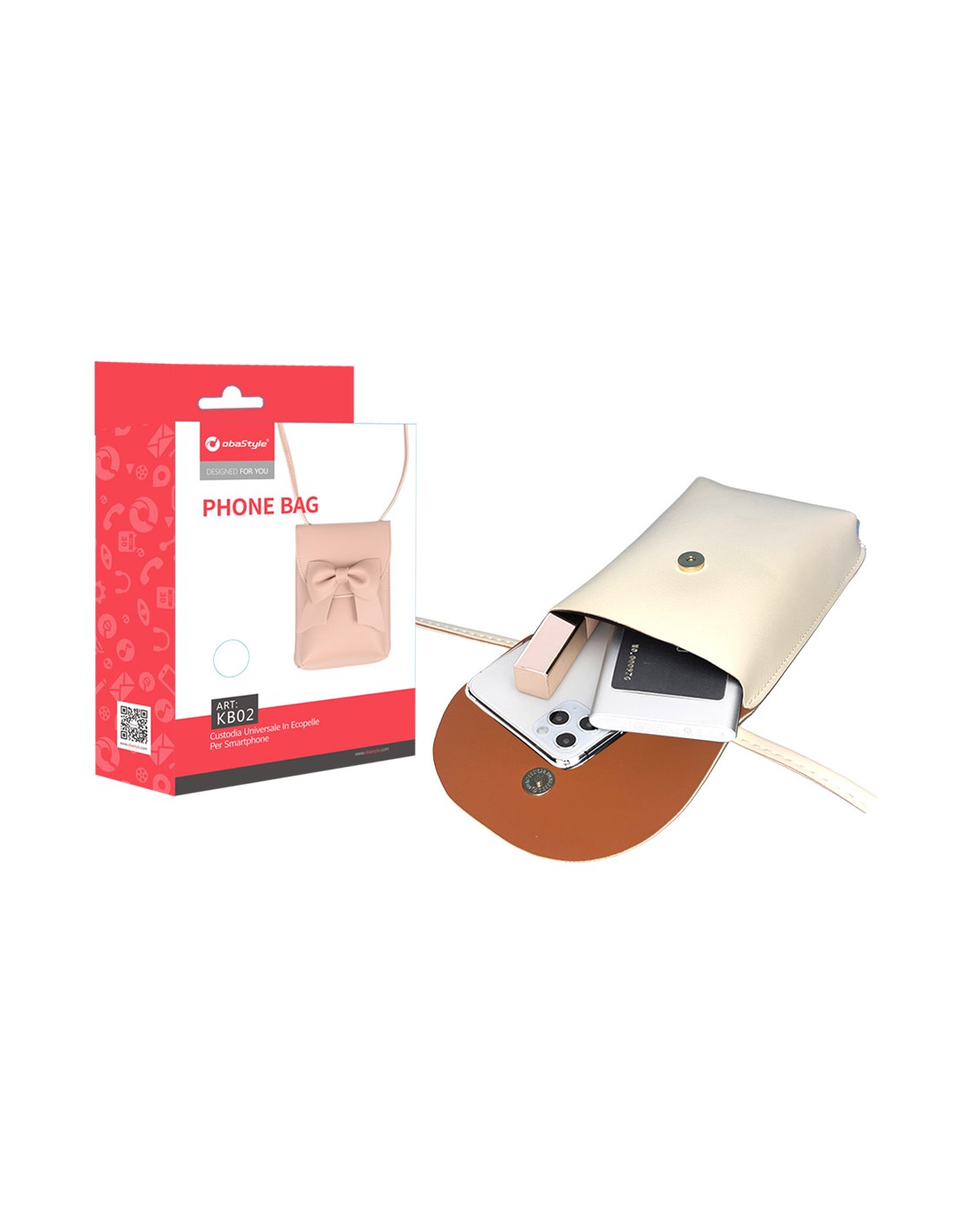 Custodia universale con tracolla e fiocco dcecorativo, realizzata in ecopelle PU, dotata di un comodo laccio da collo realizzato nello stesso materiale.