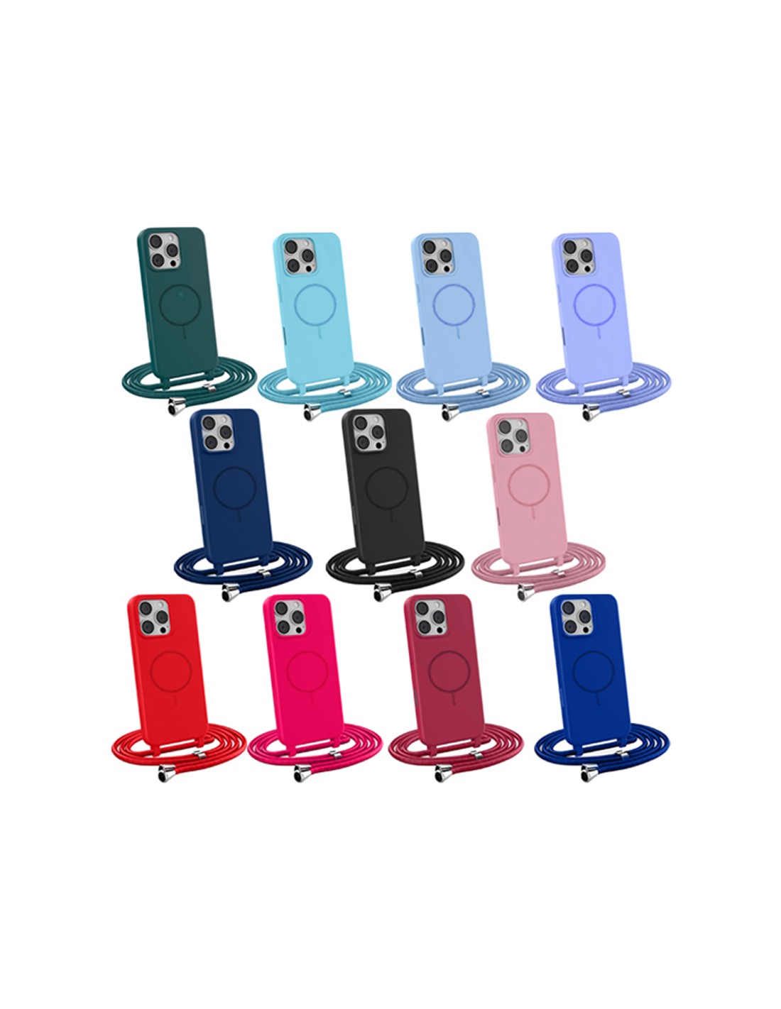 Cover morbida magnetica realizzata in silicone con effetto soft touch con laccio da collo regolabile, compatibile con la ricarica Qi.