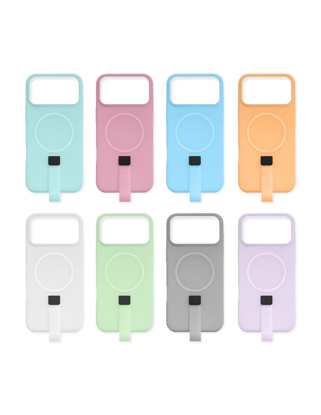 Cover morbida magnetica realizzata in silicone con effetto soft touch con laccio da collo regolabile, compatibile con la ricarica Qi.