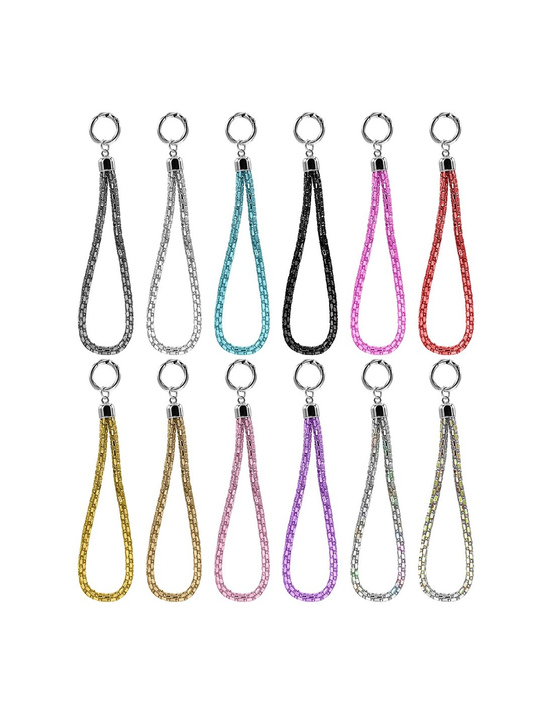 Laccio da polso con strass e patch per custodia smartphone, disponibile in colori assortiti.